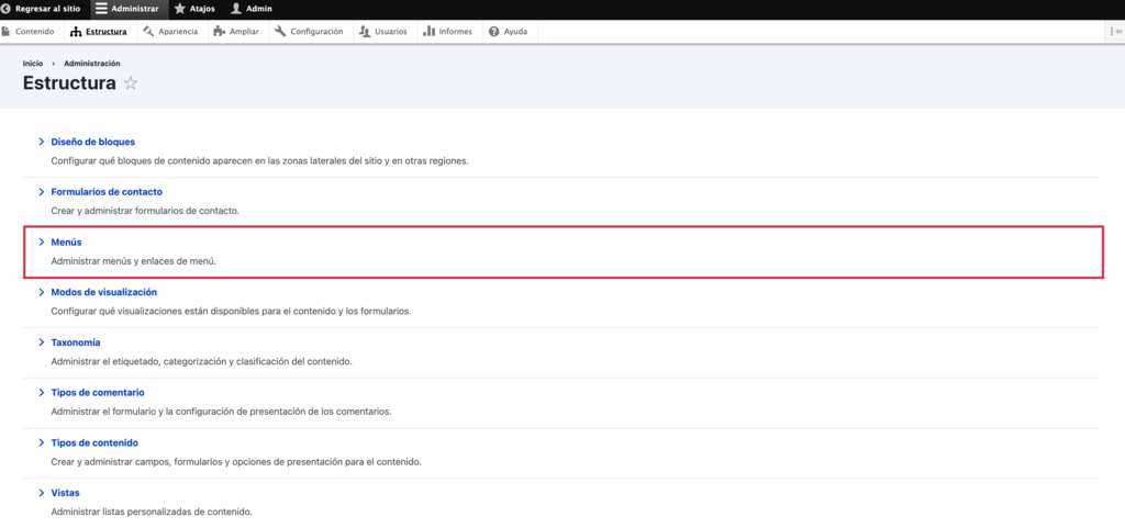 Los menús son muy importantes independientemente del tipo de sitio web que estés creando. Ayudan a categorizar y estructurar el sitio web en general. Con Drupal puedes agregar, eliminar y cambiar el nombre de los menús y sus elementos constituyentes.