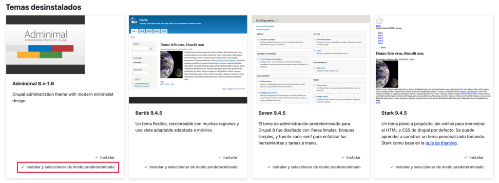 Nota: Al igual que con los módulos, asegúrate de que el tema sea compatible con tu versión central de Drupal.