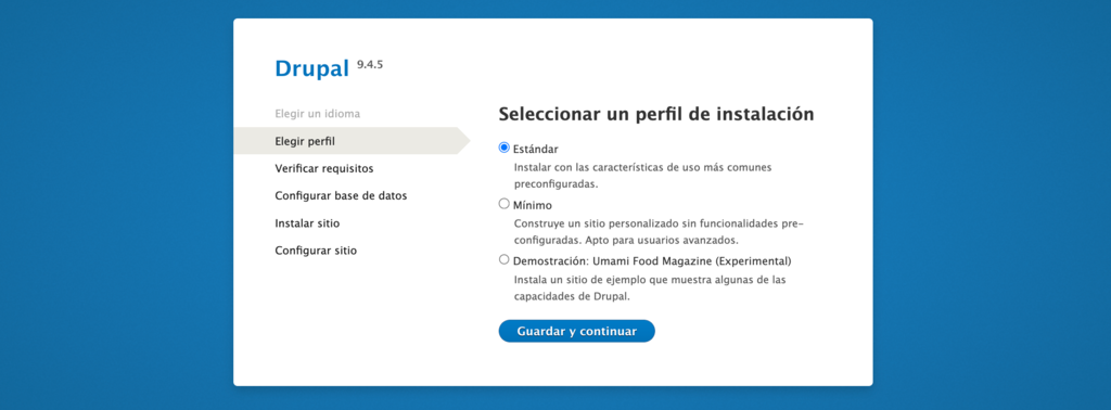 5. Elige un perfil de instalación y haz clic en Guardar y continuar. Si eres nuevo en Drupal, te recomendamos que continúes con Estándar. El perfil de instalación Mínimo es mejor para los usuarios avanzados, ya que ofrece más libertad en cuanto a la personalización.