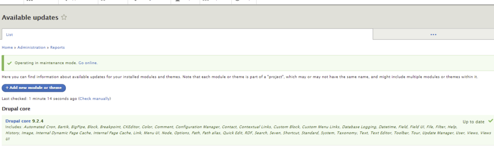 Con esto fuera del camino, navega a Informes -> Actualizaciones disponibles para ver si hay una actualización del núcleo de Drupal disponible.