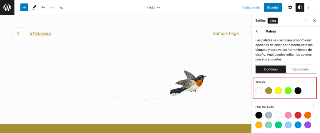 Al abrir el panel de estilos globales, verás que la paleta de colores por defecto del tema ha cambiado según el código CSS.