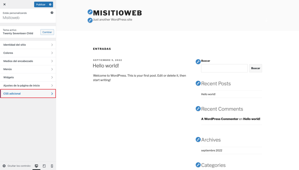Ahora, veamos los aspectos básicos de la personalización de un tema hijo. Para ello, ve a Apariencia -> Temas y haz clic en Personalizar en tu tema hijo activo. Cuando se abra el Editor de Temas, selecciona CSS adicional.