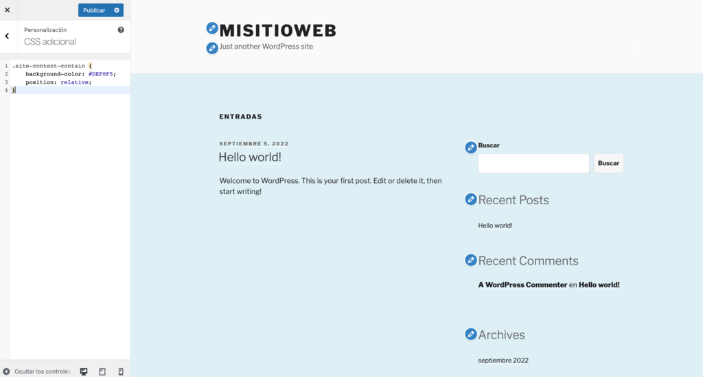 El valor junto a background-color: corresponde al código hexadecimal del color que elijas. En este ejemplo, dado que lo estamos cambiando de blanco a azul claro, el resultado se ve así: