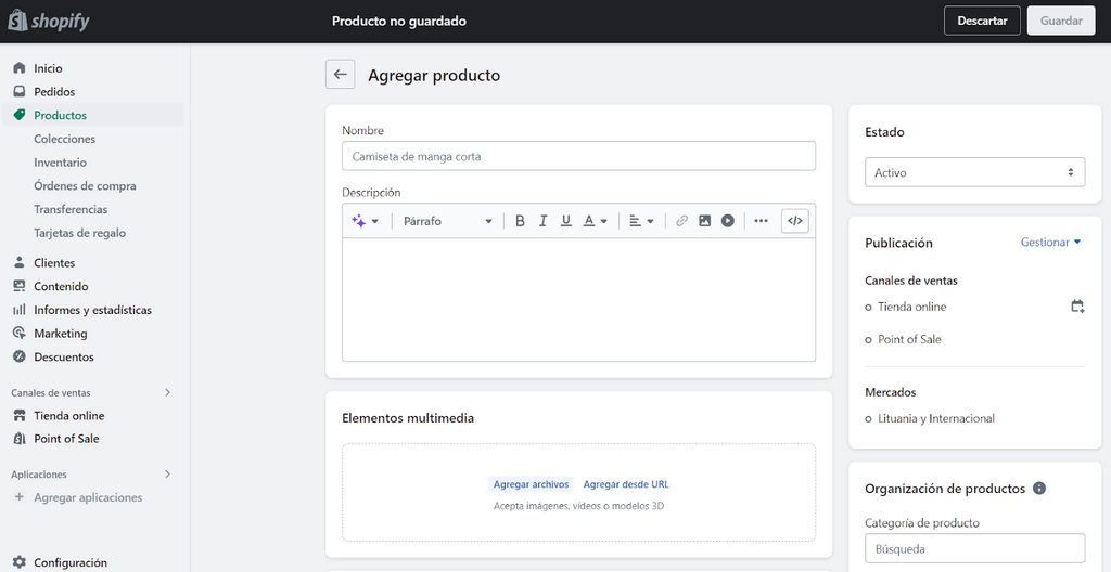 Para añadir y gestionar tus propios productos, dirígete a la sección Productos del panel de control. Haz clic en el botón Añade tus productos e introduce tus datos de envío, inventario y precios.
