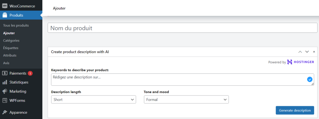 Pour les descriptions de produits avec l’IA sur votre boutique WooCommerce, suivez les étapes suivantes :