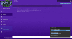 Une fois l’instance créée, cliquez sur le petit cube pour ouvrir l’interface de gestion de l’instance. Lancez une mise à jour en cliquant sur Update pour que le serveur commence le téléchargement des fichiers Hytale requis. Ouvrez immédiatement la console du serveur pendant la mise à jour.