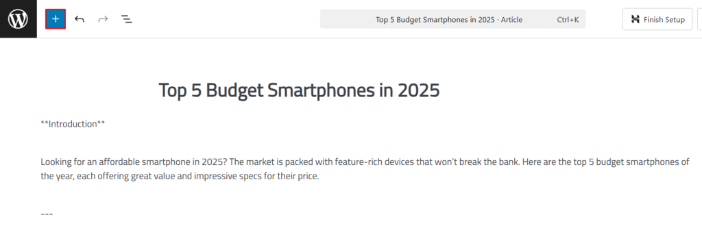 Cliquez sur l’icône Outil d’insertion de bloc + pour ouvrir le menu.
