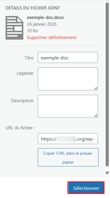 Dans la section Détails du fichier joint, renseignez le titre, la légende et la description, puis cliquez sur Sélectionner.