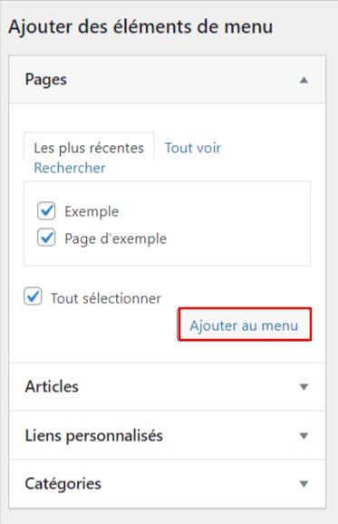 - Dans la section Ajouter des éléments de menu → Pages, cochez les cases des pages à inclure dans le nouveau menu et cliquez sur le bouton Ajouter au menu.