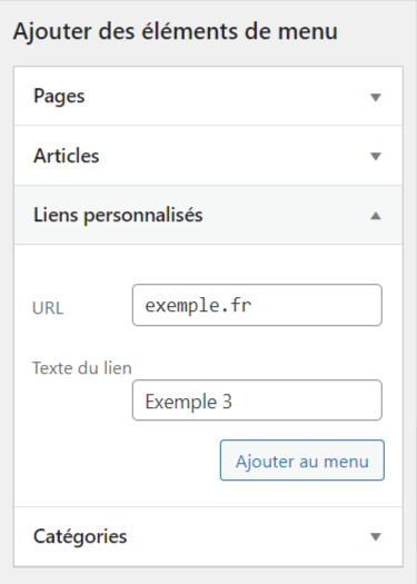 WordPress accepte également les liens personnalisés, les catégories et les articles comme options de menu. Par exemple, développez le menu déroulant Liens personnalisés dans la section Ajouter des éléments de menu et ajoutez l’URL et le texte du lien choisis en tant qu’élément de menu. C’est utile pour rediriger les visiteurs vers une page web externe.