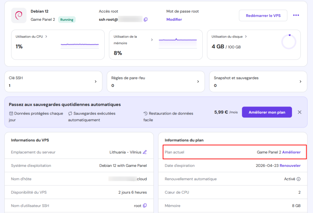Optez pour un fournisseur d’hébergement VPS qui propose des mesures de sécurité solides. Par exemple, les serveurs Minecraft d’Hostinger sont dotés d’un pare-feu intégré, d’un scanner de logiciels malveillants, d’une protection DDoS, de sauvegardes hebdomadaires automatiques gratuites et d’une garantie de disponibilité de 99,9 %.
