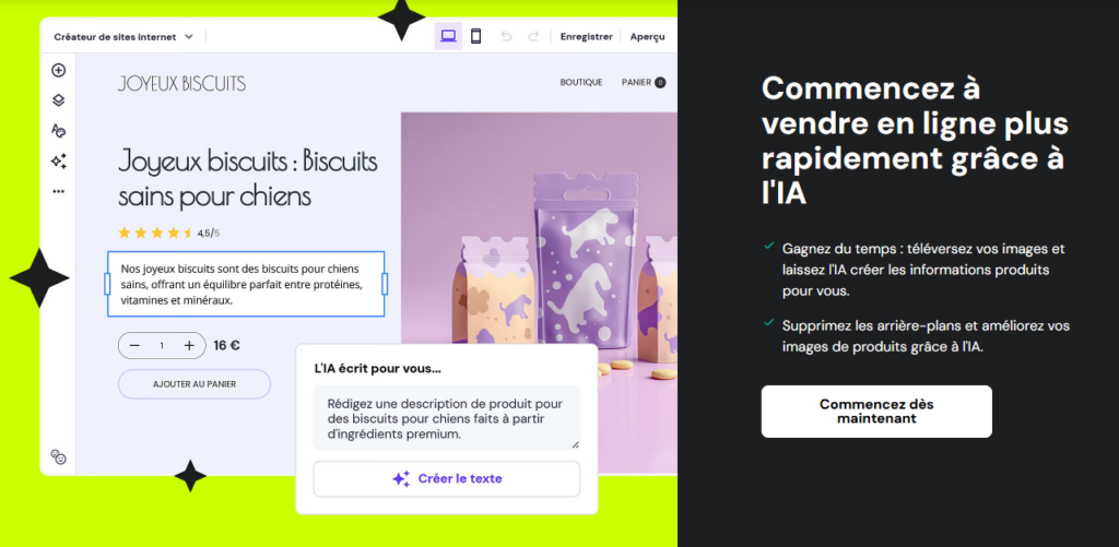 - Le Créateur de site Hostinger – idéal pour les propriétaires de petites et moyennes entreprises à la recherche d’un outil de création de site eCommerce facile à utiliser.