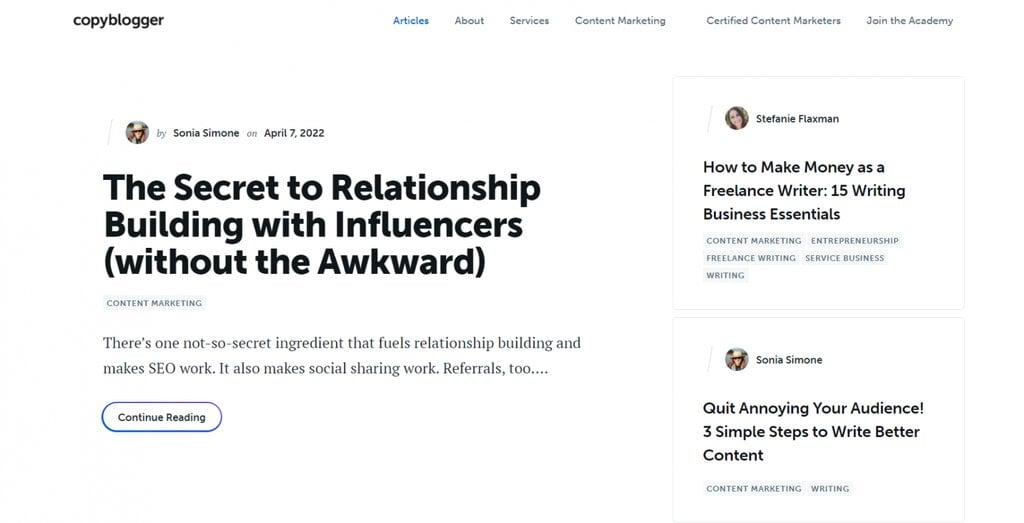 Lancé en 2006, Copyblogger est devenu une entreprise rentable à huit chiffres. Il fournit de précieuses ressources d’apprentissage, notamment des conseils sur le marketing, la rédaction et la publicité. Ses articles vous aideront à améliorer vos compétences rédactionnelles et vous apprendront à élaborer une description de produit attrayante et à construire une histoire de marque solide.