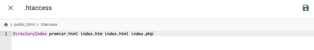 Dans notre exemple ci-dessous, nous avons décidé dechanger la page d’accueil en premier.html , ce qui signifie que le code dans .htaccess devrait ressembler à ceci:
