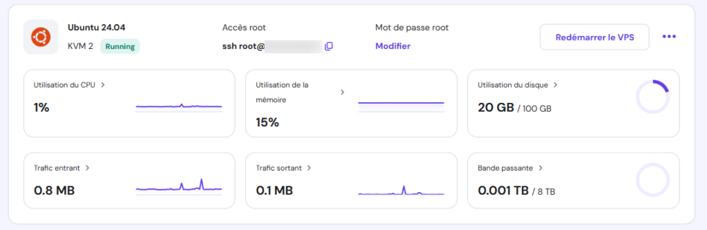 Connectez-vous à votre hPanel et rendez-vous dans VPS → Gérer. Dans le panneau Aperçu général, assurez-vous que le statut de votre serveur Hostinger VPS pour CS2 est bien En cours d’exécution. Si ce n’est pas le cas, cliquez sur le bouton Démarrer pour le lancer. Vous trouverez également les informations nécessaires pour accéder à votre serveur via les commandes SSH.