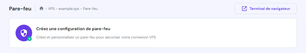 Vous pouvez également ajouter les règles de pare-feu via hPanel en vous rendant dans l’aperçu du VPS → Paramètres → Sécurité → Pare-feu. Sélectionnez Créer une configuration de pare-feu et saisissez le nom de la configuration. Cliquez sur l’icône des trois points et sur Modifier pour configurer la règle.
