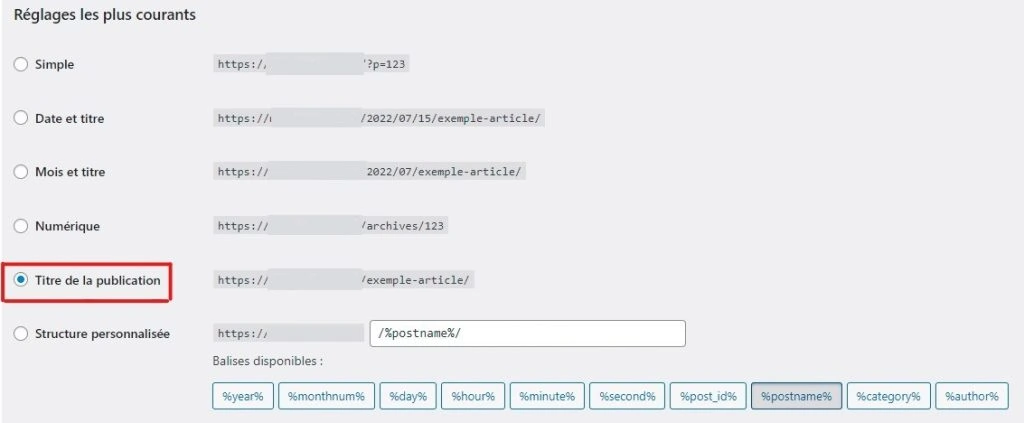 Sur la page Réglages des permaliens, sélectionnez l’option Titre de la publication. Elle deviendra ainsi la nouvelle valeur par défaut pour les URL de votre site web.
