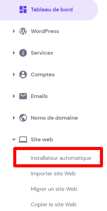 Sur votre compte, faites défiler le hPanel jusqu’à ce que vous voyez la catégorie Site web. Cliquez sur Installateur Automatique.