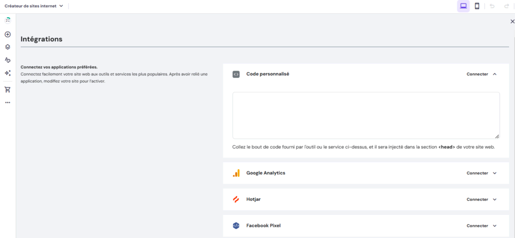 Il suffit d’accéder aux paramètres des intégrations directement à partir du créateur pour gérer et ajouter divers outils afin d’améliorer les fonctionnalités de votre site web.