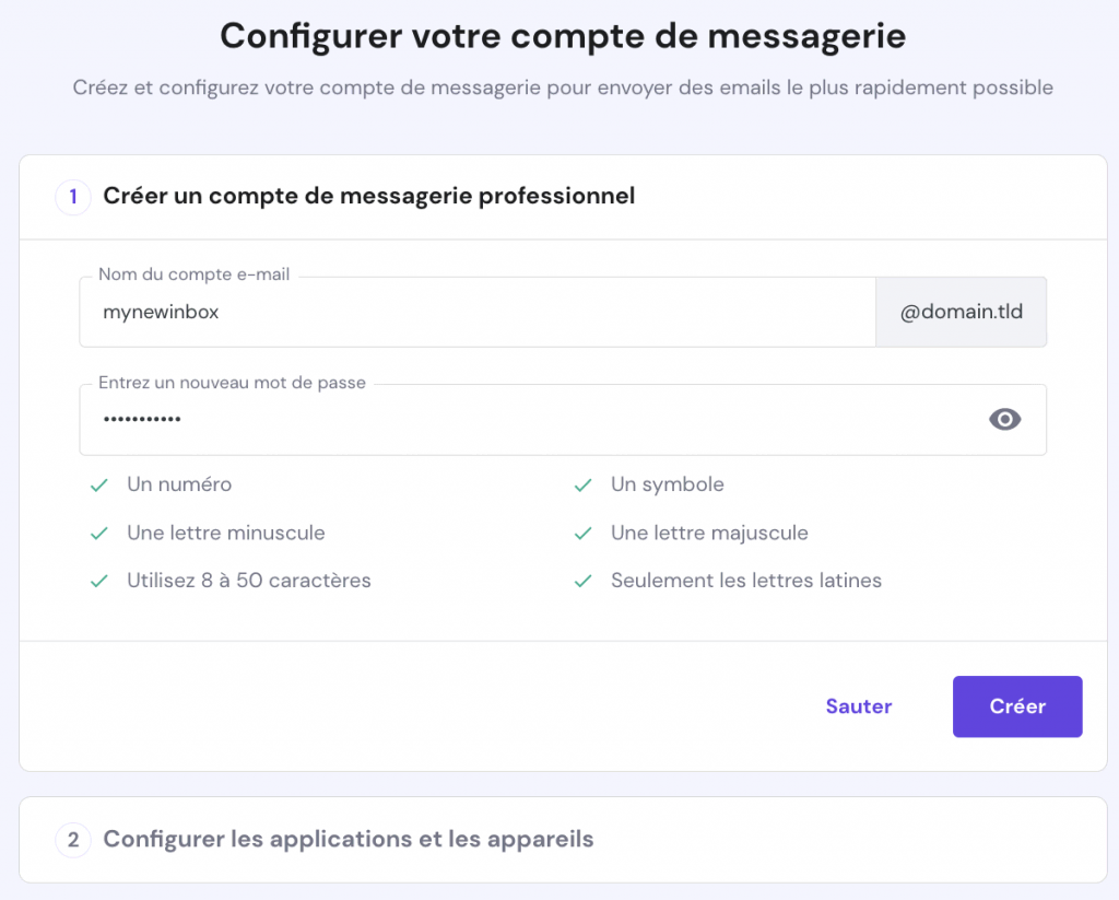 - Configurer la boîte mail. Créez une adresse e-mail professionnelle en saisissant le nom complet, l’adresse et le mot de passe.