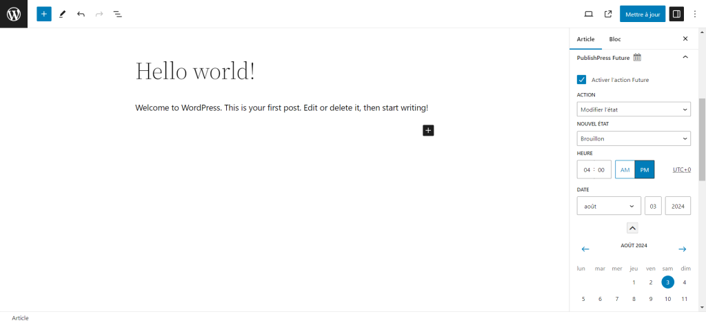 Après avoir activé le plugin, vous verrez le menu PublishPress Future dans le panneau des réglages de l’éditeur de blocs. Cochez la case Activer l’action Future pour définir une action à effectuer sur l’article, ainsi que la date et l’heure d’application du changement.