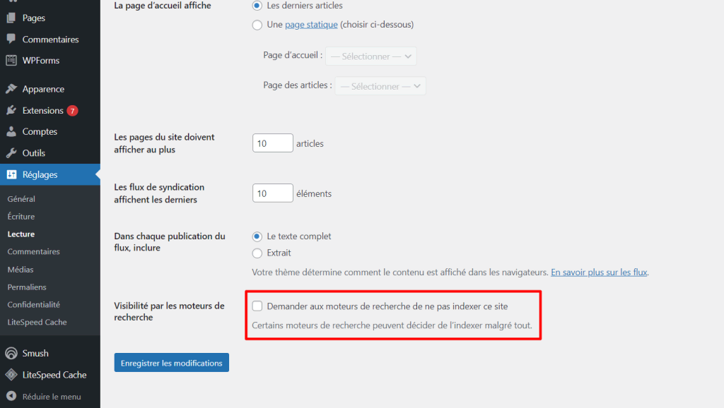 Il vous suffit de vous rendre dans la rubrique Réglages → Lecture de votre tableau de bord WordPress. Ensuite, trouvez l’option Visibilité par les moteurs de recherche et cochez la case Demander aux moteurs de recherche de ne pas indexer ce site. Cliquez sur Enregistrer les modifications.