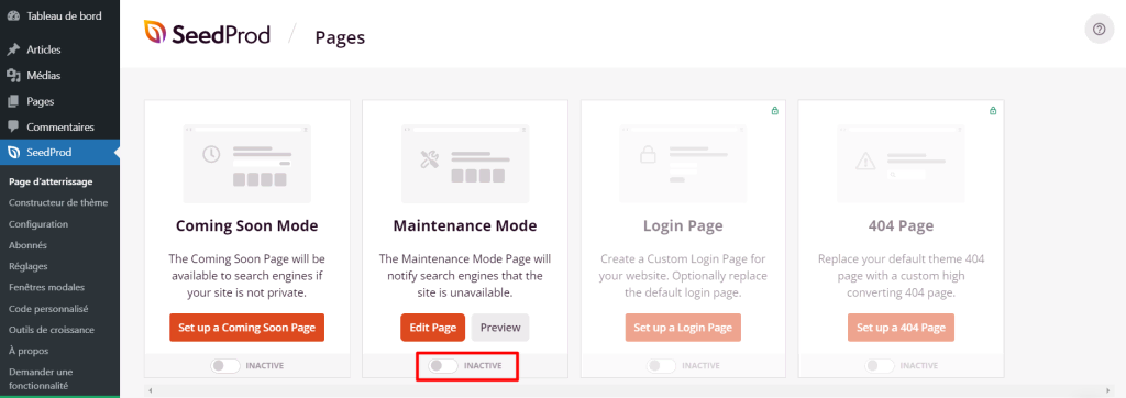 - Cliquez sur le bouton Inactive sous la section Maintenance Mode. Une fois qu’il devient vert, l’ensemble de votre site ne sera plus accessible au public.