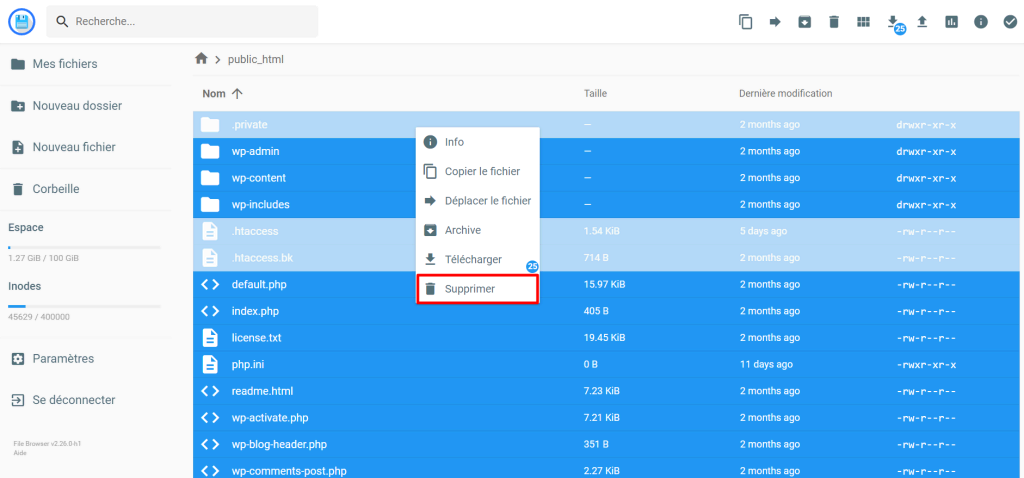 - Sélectionnez tous les fichiers associés à l’installation de votre site WordPress. Appuyez simplement sur CTRL + A sous Windows ou cmd + A sous macOS.