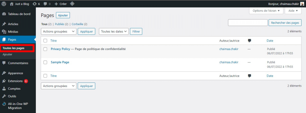 - Allez dans Articles > Tous les articles ou Pages > Toutes les pages si vous souhaitez plutôt apporter des modifications à une page.