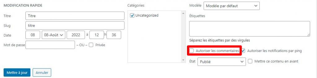La deuxième option consiste à utiliser la fonction de modification rapide que vous trouverez dans le menu d’administration des articles ou des pages.
