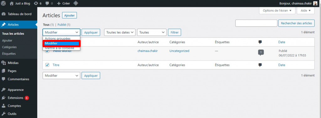 2. Sélectionnez tous les articles en cochant la case située dans le coin supérieur gauche du tableau. Choisissez Modifier dans la liste déroulante des actions groupées.