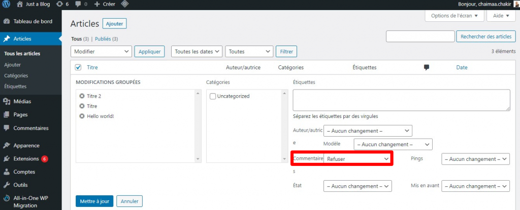 Ce paramètre est un peu plus rapide que la première option (modification en bloc). Malheureusement, vous ne pouvez pas appliquer cette technique aux pages. Si vous avez des commentaires sur vos pages et que vous souhaitez les désactiver en masse, suivez la première option.