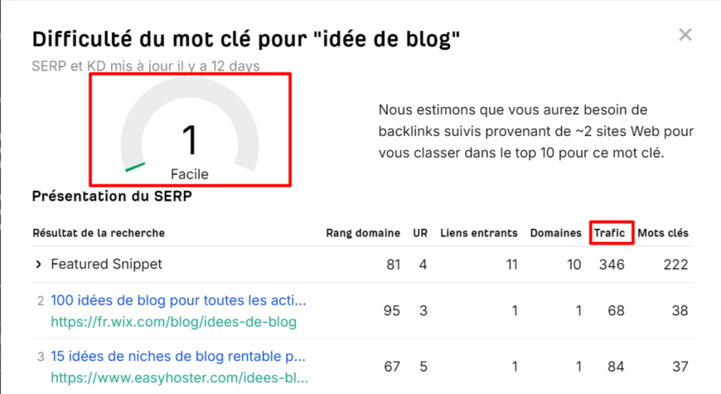 Voici un exemple du terme “idée de blog” et de son score de difficulté de mot-clé basé sur le vérificateur d’Ahrefs.