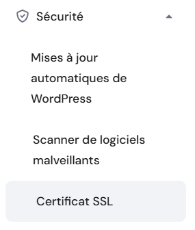 Dans le tableau de bord, accédez à l’onglet Sécurité et cliquez sur SSL dans la barre latérale gauche. Une fois sur cette page, localisez votre domaine principal dans la liste et cliquez sur Installer SSL pour activer votre certificat SSL gratuit.