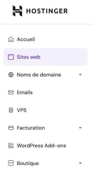 Allez dans la section Sites web dans hPanel. Vous y trouverez une liste de tous les sites hébergés sous votre compte. Cette section vous permet de gérer différents aspects de votre site web, comme modifier son design et gérer l’hébergement.