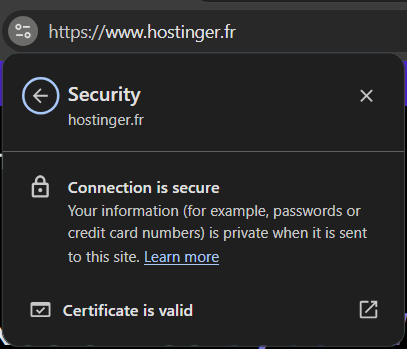 Pour vérifier si votre certificat SSL a été installé automatiquement, rendez-vous sur votre site web et recherchez l’icône de cadenas dans la barre d’adresse de votre navigateur. Cliquez sur l’icône et sélectionnez l’option La connexion est sécurisée pour afficher les détails du certificat. Vous pouvez également vous connecter à votre compte Hostinger et accéder à hPanel pour consulter l’état du SSL.