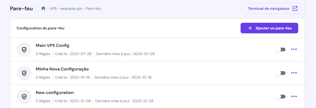En plus de la performance, maintenez la sécurité de votre serveur de jeu pour garantir l’intégrité des données et la disponibilité du service. Parmi les étapes importantes, citons l’activation des sauvegardes automatiques et la mise en place de règles de pare-feu, ce que vous pouvez facilement faire via le hPanel de Hostinger.