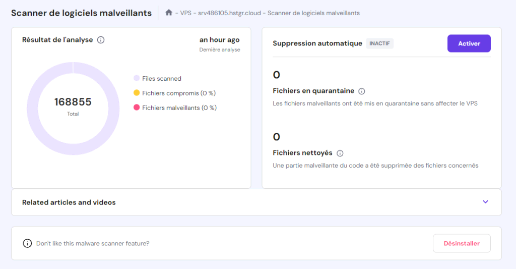 Pour maintenir la sécurité de votre serveur, recherchez régulièrement des logiciels malveillants afin de vérifier si votre système est infecté. Les utilisateurs d’Hostinger peuvent le faire à l’aide du logiciel intégré Monarx. Moyennant un coût supplémentaire, ils peuvent également supprimer automatiquement les logiciels malveillants en un seul clic.