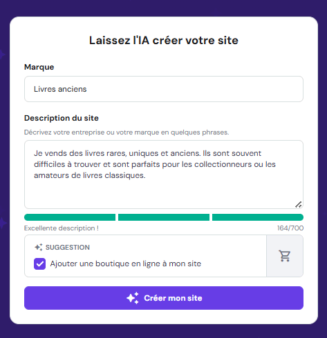 Pour vous hisser encore plus haut dans les moteurs de recherche comme Google, assurez-vous que votre site se charge rapidement et qu’il soit réactif. Heureusement, tous les sites web construits avec notre Créateur IA sont adaptés aux mobiles par défaut.