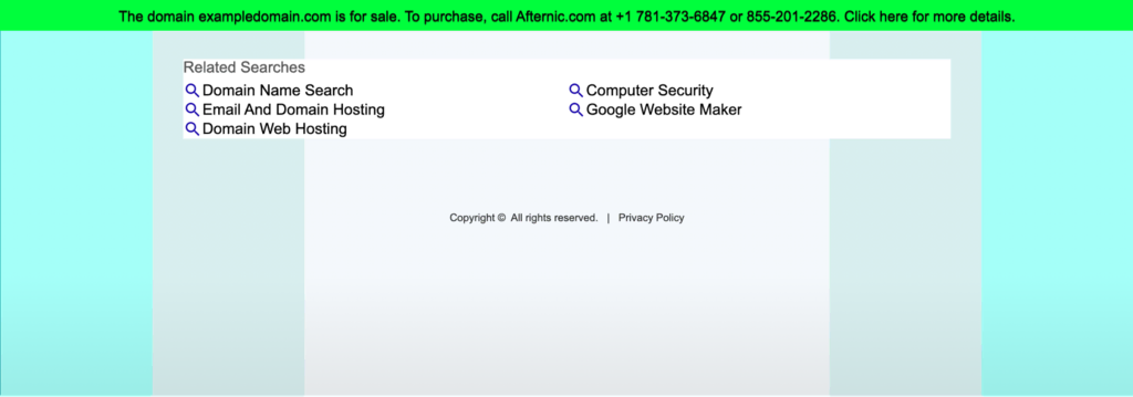 Certains noms de domaine sont rachetés pour être revendus plus tard à un prix plus élevé. Dans ce cas, le site existant indiquera que le domaine est disponible à la vente et fournira immédiatement les coordonnées du propriétaire, comme dans l’exemple ci-dessous.
