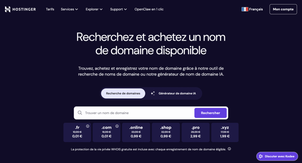 Ces outils vous aident à voir quels noms de domaine sont disponibles et peuvent suggérer des variantes des noms que vous envisagez. Ils affichent souvent des extensions alternatives (.fr, .com, .net) si le .com que vous souhaitez n’est pas disponible. Certains peuvent également suggérer des noms similaires encore libres.