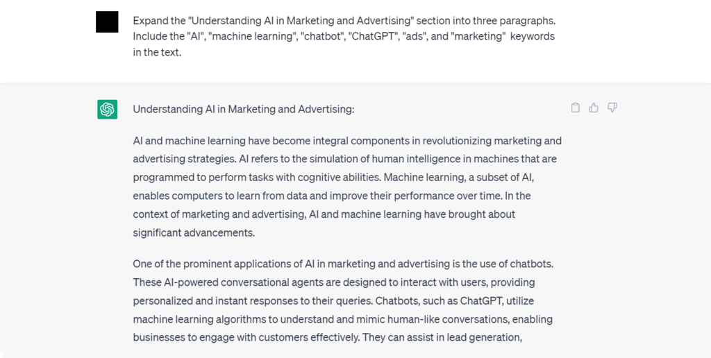 Après avoir créé le plan de l’article de blog, développez chaque section pour créer le contenu complet. Cependant, vous devez générer chaque section individuellement car ChatGPT n’écrit qu’environ 500 mots dans chaque sortie.