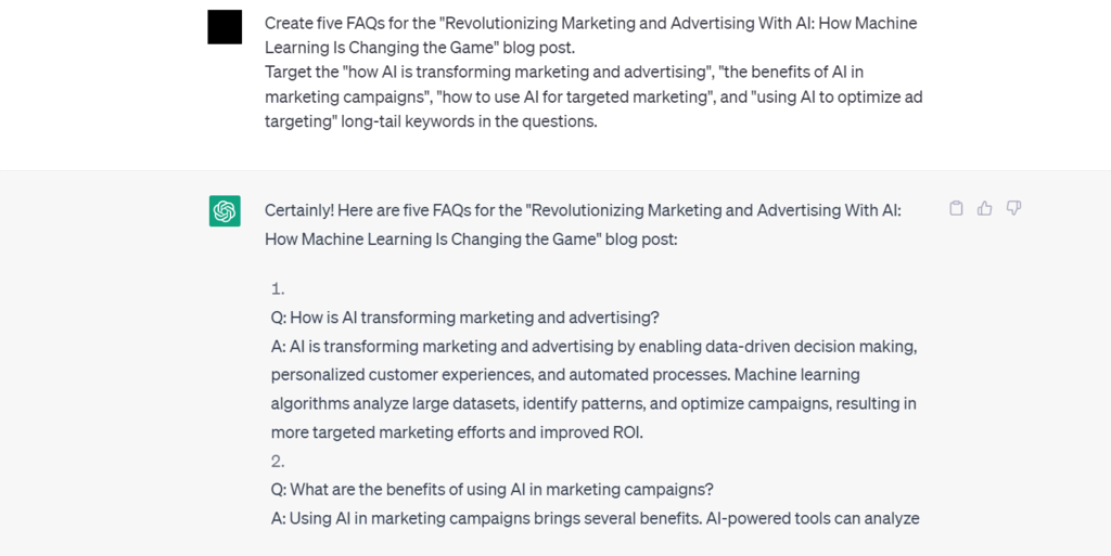Pour générer des FAQ, indiquez à ChatGPT le titre de votre article de blog et le nombre de questions. Pour vous assurer que les questions générées ciblent la bonne intention de recherche, utilisez un outil SEO pour les vérifier.