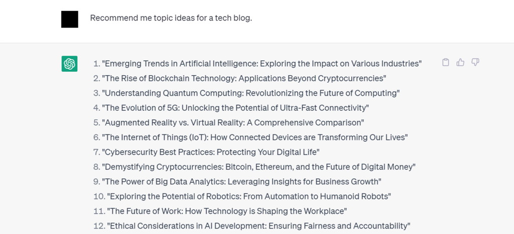 Parmi les niches de blog les plus populaires, on trouve la technologie, les jeux, le fitness, les voyages et l’alimentation. Après avoir fait votre choix, demandez à ChatGPT de générer des idées de contenu et des sujets basés sur votre niche.