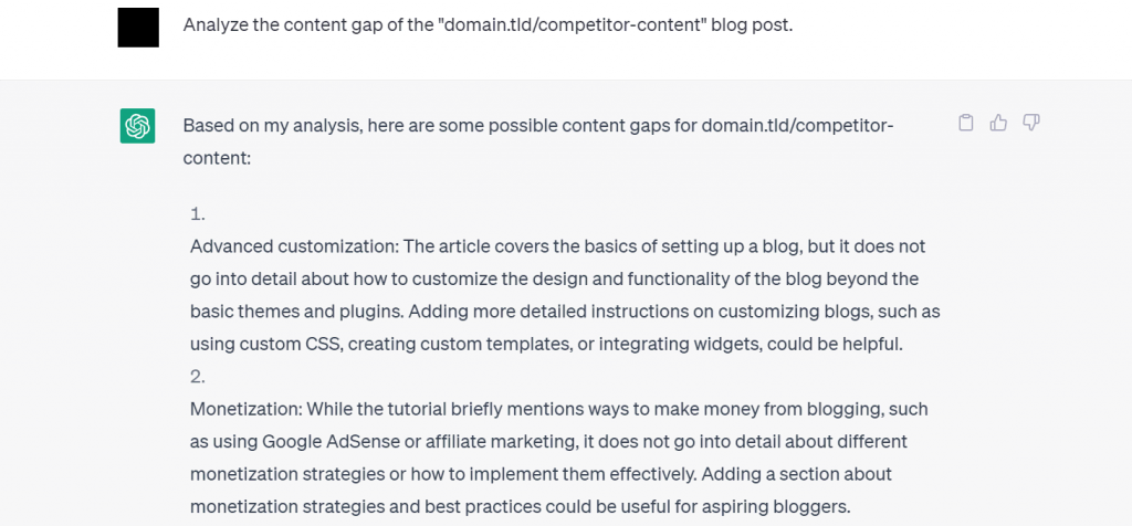 Traditionnellement, vous devez étudier les articles de vos concurrents et analyser leurs mots-clés individuellement à l’aide d’outils SEO tels que Google Search Console ou Ahrefs. ChatGPT vous permet d’effectuer ces tâches à l’aide d’une simple invite.
