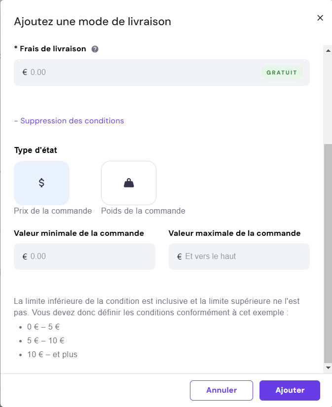 - Frais de port forfaitaires. Un moyen simple de normaliser le prix de la livraison.