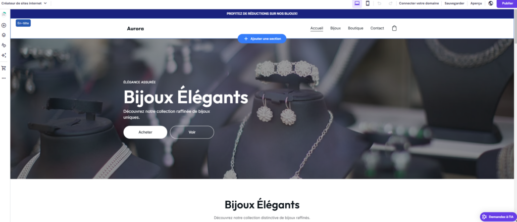 - Solutions alimentées par l’IA. Accédez à notre suite d’outils d’IA tels que le créateur de logo IA et le rédacteur IA pour accélérer le processus de création de votre site web. Vous pouvez également décrire votre marque de bijoux en quelques mots et laisser le créateur de sites IA créer un site entièrement personnalisé.