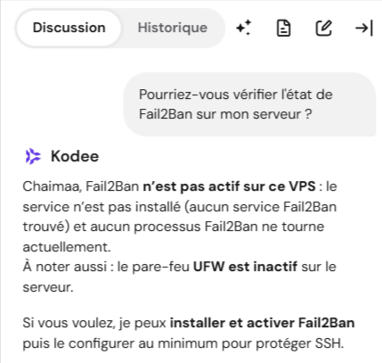 Vous pouvez également demander à Kodee de redémarrer Fail2Ban en saisissant simplement : « Redémarrer Fail2Ban sur mon VPS. »