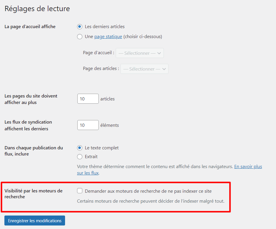 WordPress est doté d’une fonctionnalité pour demander aux moteurs de recherche de ne pas indexer le site internet. Ce paramètre devrait être désactivé par défaut, mais il est préférable de le vérifier.