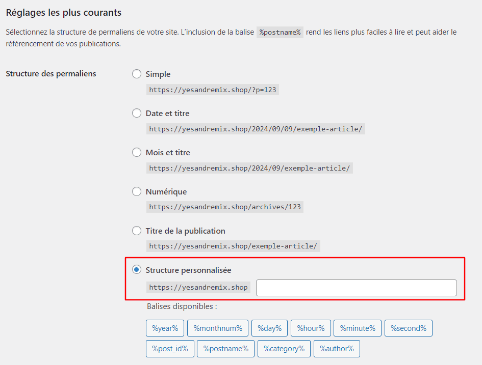 Allez dans Tableau de bord → Réglages → Permaliens pour modifier la structure de permaliens par défaut. Ensuite, sélectionnez l’option Structure personnalisée et incluez les balises nécessaires.